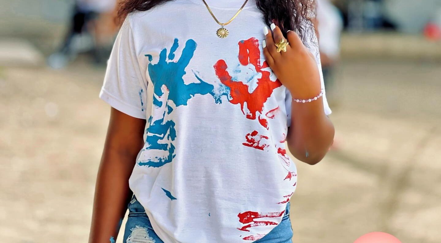 Une fêtarde arborant un maillot orné d’empreintes de mains colorées.