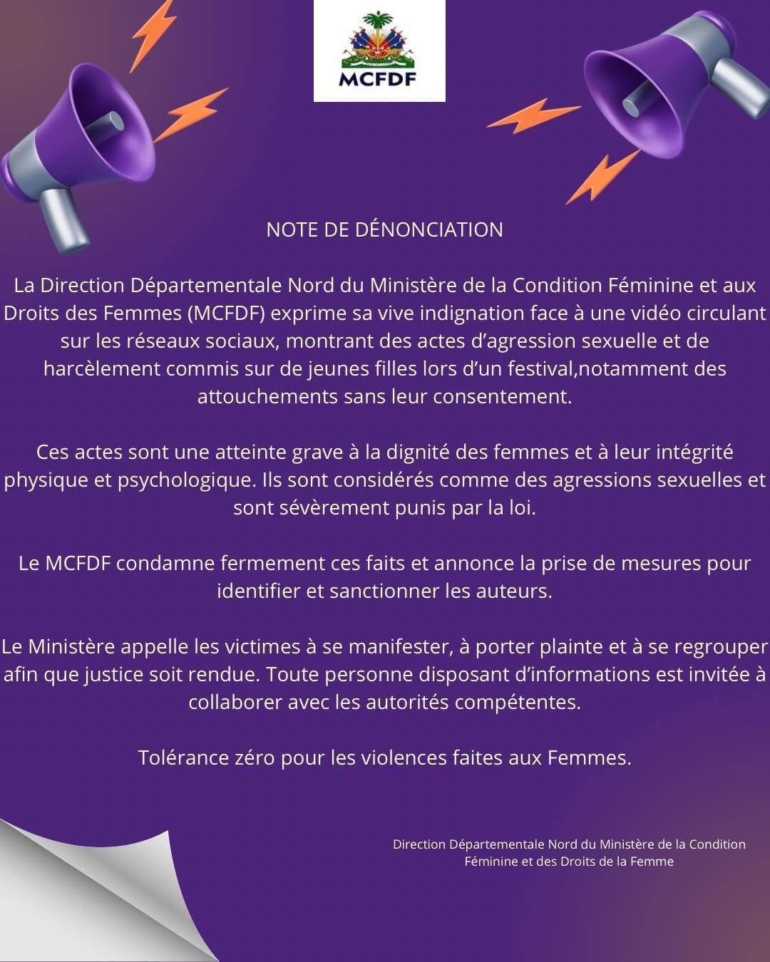 C’est face à cette dérive alarmante que les autorités ont fini par briser le silence. Suite à la circulation de vidéos d’agressions sur les réseaux sociaux dans le département du Nord, la Direction Départementale du Ministère de la Condition Féminine et aux Droits des Femmes (MCFDF) a publié une note de dénonciation ferme. Exprimant sa « vive indignation », le bureau a clairement qualifié ces actes d’agression sexuelle et de harcèlement, rappelant qu’ils sont « sévèrement punis par la loi ». La direction a non seulement annoncé la prise de mesures pour identifier et sanctionner les auteurs, mais a également appelé les victimes à porter plainte, martelant un message clair : « Tolérance zéro pour les violences faites aux Femmes ».