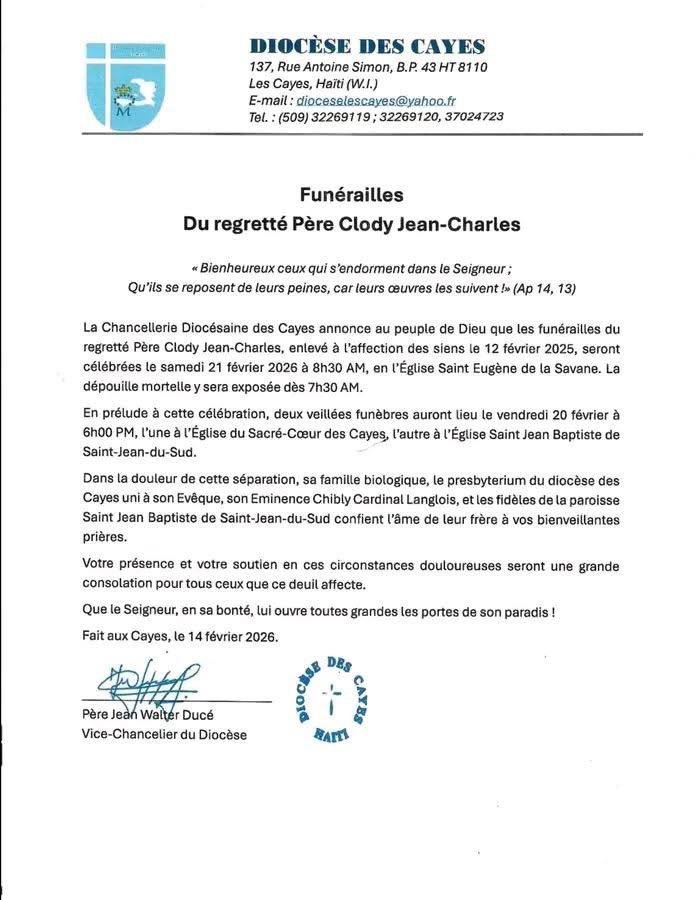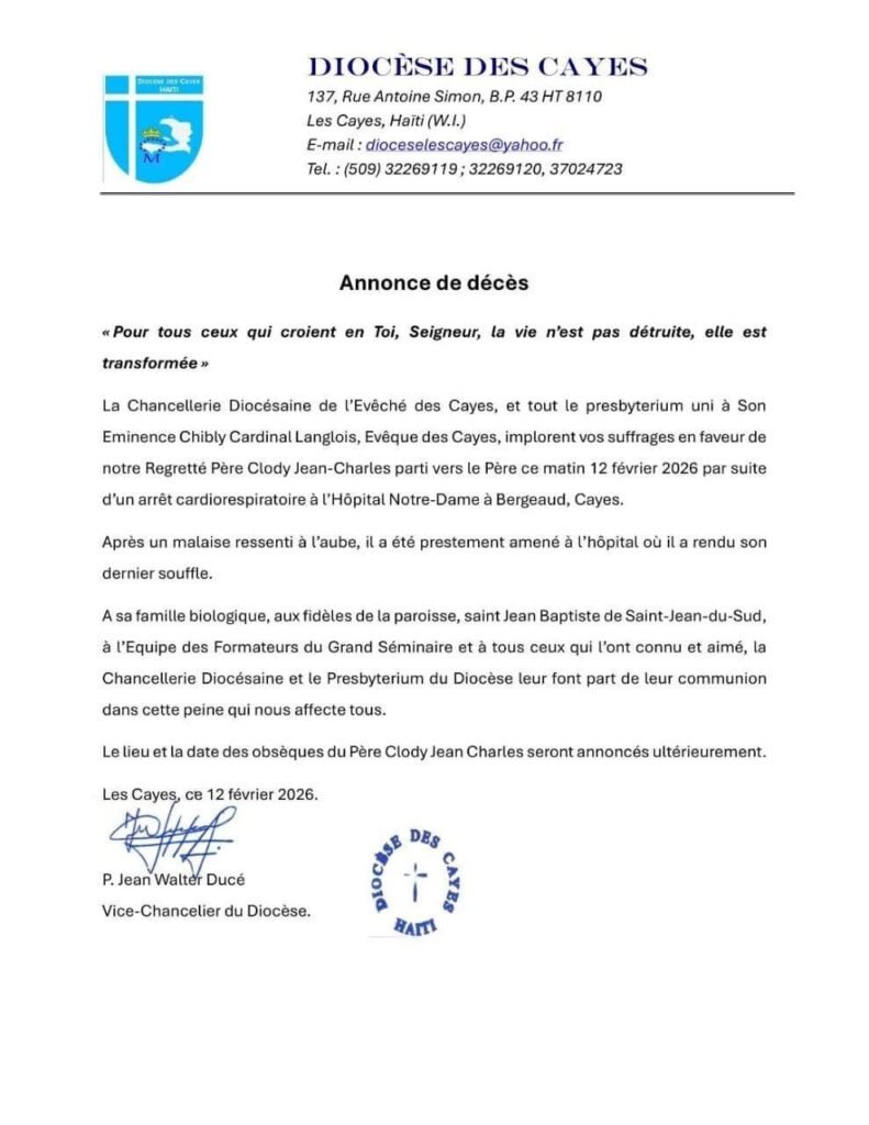 Le matin du 12 février 2026, j’étais sur le point de sortir pour me rendre à un rendez-vous lorsque mon regard s’est arrêté sur un message publié dans un groupe WhatsApp, annonçant la mort du Révérend Père Clody Jean-Charles, prêtre du diocèse des Cayes et professeur de philosophie. Peu de temps après, la chancellerie diocésaine a confirmé son décès en précisant : « Après un malaise ressenti à l’aube, il a été prestement amené à l’hôpital où il a rendu son dernier souffle ».